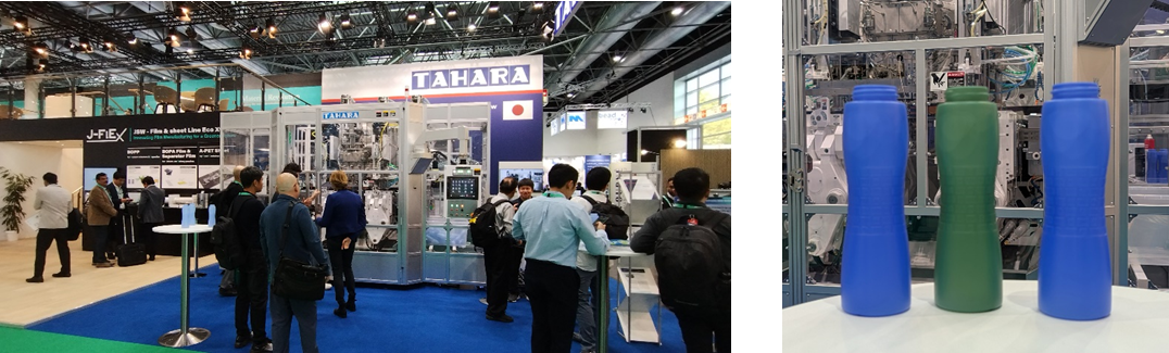 弊社は、親会社のJSWブースにて、PCR材を中間層に使用した3種3層構造の1Lプラスチックボトルを成形。サステナビリティを重視する欧州市場のニーズに応える、多層成形技術をアピールしました。