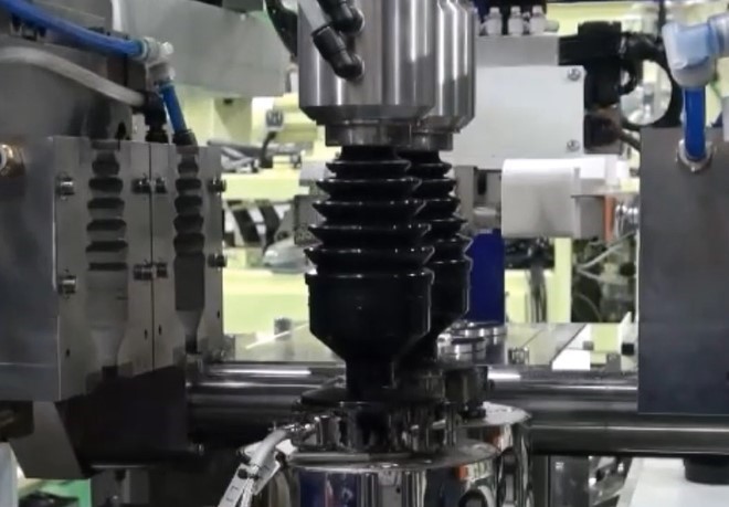 Bellows boot of the below picture is made by our fully electric injection blow molding machine (HPS). Mouth part is formed by the injection molding and the body part is formed by the blow molding. Because of this, it is possible to make a precise shape in mouth part and control the wall thickness in the body part.