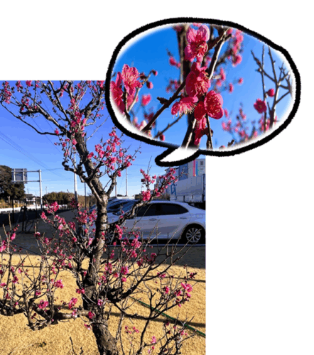 じゃ、じゃーん。弊社の敷地にある梅でございます。年々、華やかさを増しているようです。鮮やかな紅色が青空に映えます。