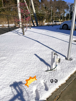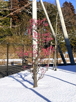 映えると言えば、雪がどっさりと降った日がありました。雪の白、晴れ渡った空の青に、差し色として紅梅がとっても綺麗だったので、近くで写真を撮ろうと思ったんです。