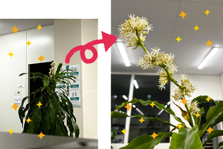 先日、咲きそうです!と開花予報を出しました。それから数日経った夕方終業間際に、独特の芳香が事務所フロアに漂い始め、「お!」と思い目線を向けると。。。